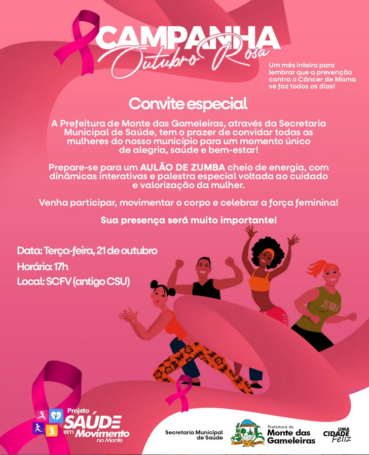 A Prefeitura de Monte das Gameleiras, por meio da Secretaria Municipal de Saúde, convida todas as mulheres do município para um aulão de Zumba cheio de energia, com dinâmicas interativas e uma palestra especial sobre valorização e cuidado com a saúde da mulher