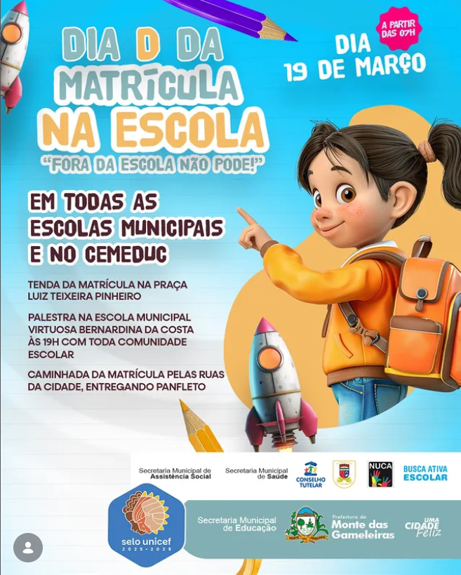 A Prefeitura de Monte das Gameleiras, por meio da Secretaria Municipal de Educação e em parceria com diversas instituições, realizará no próximo dia 19 de março, a partir das 7h, o Dia D da Matrícula na Escola, reforçando a importância de garantir que todas as crianças e adolescentes estejam estudando.