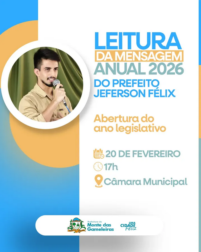 A Prefeitura de Monte das Gameleiras convida toda a população para a Leitura da Mensagem Anual 2026 do prefeito Jeferson Félix, marcando a abertura do ano legislativo.