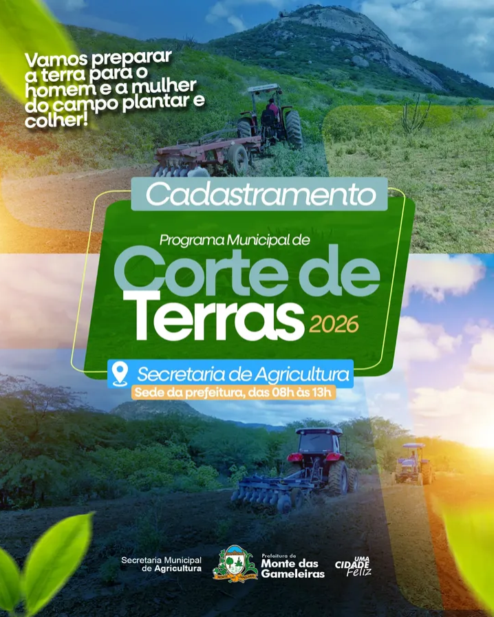 A Prefeitura de Monte das Gameleiras, por meio da Secretaria Municipal de Agricultura, iniciou o cadastramento para o Programa Municipal de Corte de Terras 2026, uma importante ação de apoio ao homem e à mulher do campo.