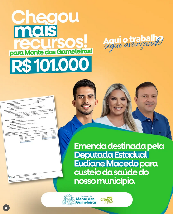 A Prefeitura de Monte das Gameleiras recebeu mais um importante reforço para a saúde do município. Foram destinados R$ 101.000,00 por meio de emenda parlamentar da Deputada Estadual Eudiane Macedo, para o custeio dos serviços de saúde.